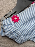 Farve: Lyseblå og hvidstribet med lyserøde detaljer.