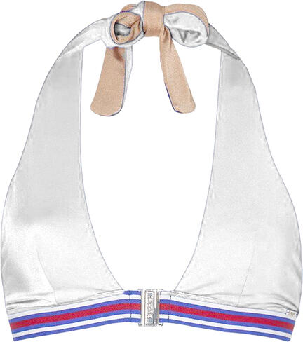 Hvis du leder efter en halterneck-top, der både er sporty og behagelig, så er Nona halterneck-toppen i hvid perfekt til dig! Toppen har en elastik med et stribet mønster forneden. Toppen sidder også behageligt, da den er lavet af mikrostof. Matchende bikinitrusser fås for at fuldende dette sporty look!