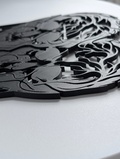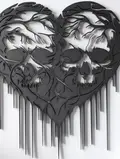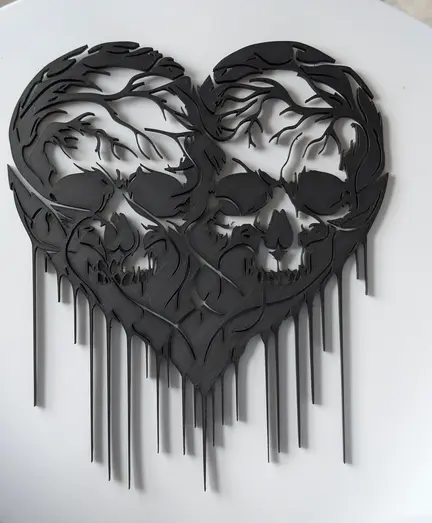 Giv din væg et spændende og edgy udtryk med denne sorte hjerte-dekoration. Den har et detaljeret motiv af to kranier, omkranset af grene. Den unikke "dryppende" effekt i bunden tilføjer en cool og moderne detalje. Nem at montere og passer perfekt til moderne, gotiske eller alternative hjem. Lavet af slidstærkt materiale, der sikrer lang holdbarhed.